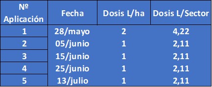 Para la evaluación se aplicó ProHydriQ en conjunto con el fertirriego según las siguientes dosis y fechas: