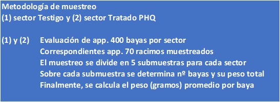 Para la evaluación del efecto sobre el calibre de las bayas (diámetro ecuatorial) del tratamiento ProHydriQ se utilizó la relación que existe en peso y diámetro de las bayas, de forma de hacer mucho mas fácil y confiable las mediciones sobre un número elevado de bayas.