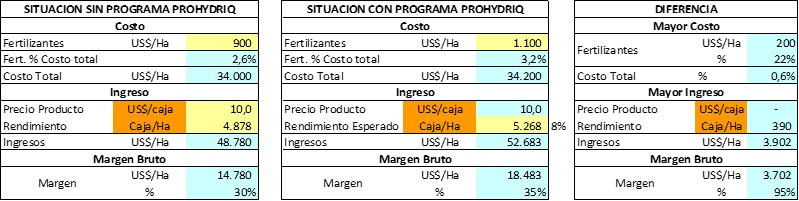 Existe un efecto positivo del tratamiento ProHydriQ sobre el peso de las bayas (y por ende sobre calibre) de las bayas que resulta estadísticamente significativo al 0,05.